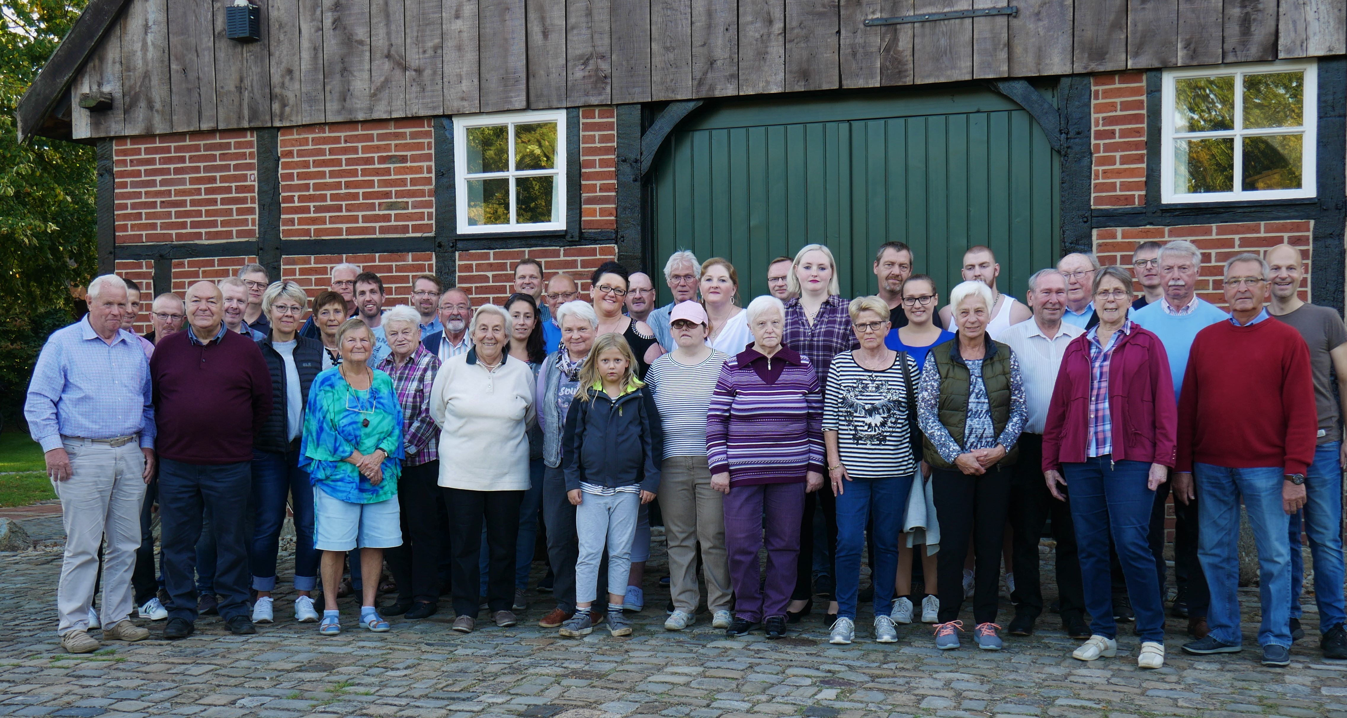 Am Samstagabend, 14. September kamen insgesamt 40 ehemalige Aktive sowie alle aktuellen Gruppen des Vereins am Heimathaus zusammen. Viele Ehemalige hatten sich seit der Eröffnung des Heimathauses vor 25 Jahren nicht mehr gesehen. So gab es zwischen allen viel zu erzählen, jeder konnte seine Erinnerungen an die damalige Zeit und zahlreiche Erlebnisse einbringen. Auf der Upkammer konnte man einen alten Schmalspurfilm sehen, der den Abriss des Kötterhauses Storm 1980 auf dem Hofgelände in Catenhorn zeigte. Außerdem gab es viele Fotos vom Wiederaufbau in den Jahren 1989-1990, auf denen sich viele Beteiligte wiedererkannten.