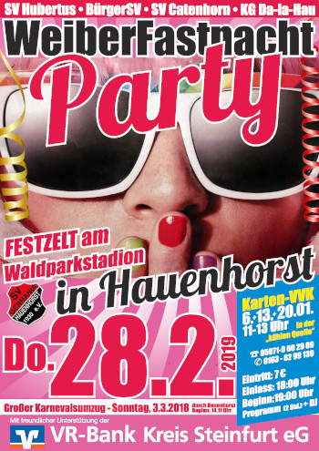 Am Samstag, 23. Februar 2019 gab es eine besondere Premiere: Der Schützenverein Hubertus Hauenhorst, der Bürgerschützenverein, der Schützenverein Catenhorn und die KG DA-LA-HAU feierten zum ersten Mal eine große Prunksitzung. 900 Närrinnen und Narren versammelten sich im Festzelt am Waldparkstadion, um einen gemeinsamen Abend mit karnevalistischem Tanz, Musik-Parodie, Zauberkunst und Gesangsdarbietungen zu erleben.