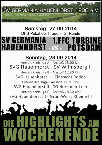 Nach dem 1:0 Sieg der 1. Damen-Mannschaft des SV Germania Hauenhorst in der ersten Runde des DFB-Pokal gegen den 1. FC Union Berlin fand am 30. August die Auslosung der 2. Runde statt. So wird es am Wochenende 27./28. September eine neue Top-Begegnung im Waldparkstadion geben. Denn als neuer Gegner wurde den Germanen-Damen der Bundeligist 1. FFC Turbine Potsdam zugelost.